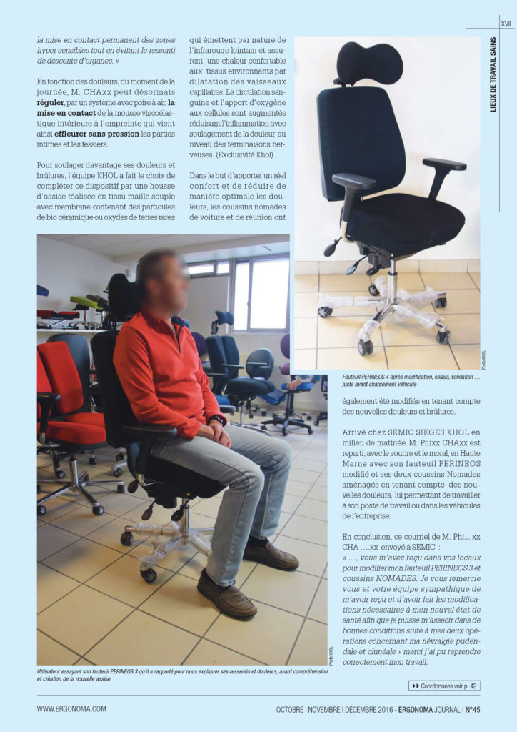 SEMIC LES SIEGES KHOL a été consulté pour répondre au besoin d’équipement du poste de travail en fonction du descriptif et plan des douleurs. Fabrication et livraison courant mars 2016 d’un fauteuil PERINEOS 3 avec empreinte spécifique sur mesure Pudendal périneal n°13+25, réglages lombaires, accoudoirs 3D, appui-nuque FLEXIO 3D articulé, membrane bio céramique, ainsi que d’un coussin nomade voiture et d’un coussin nomade de réunion.