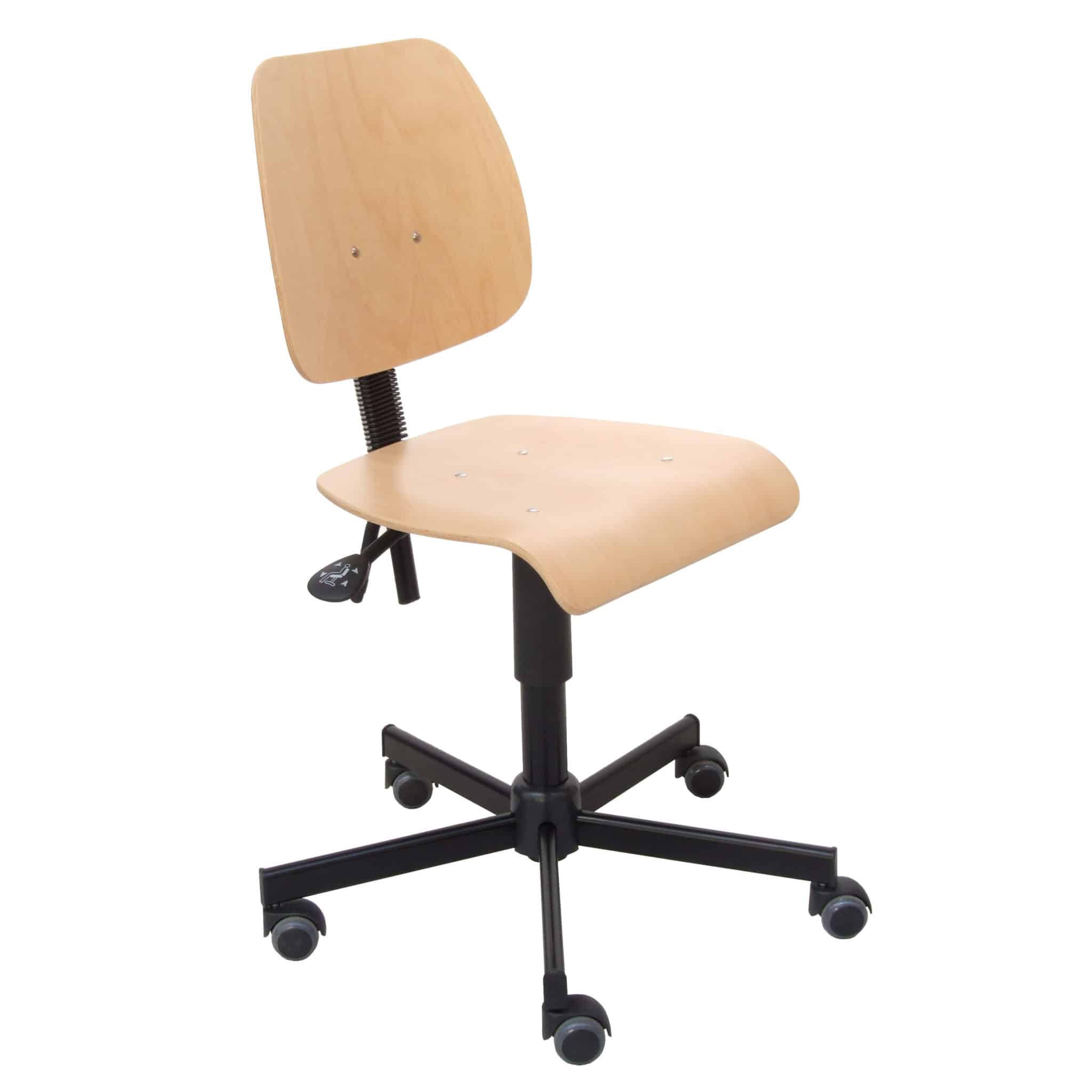 Assise ergonomique galbée arrondi à l’avant L 425 x P 400 mm et dossier moyen à double cambrure anatomique L 380 x H 340 mm en multiplis de hêtre épaisseur 8 mm chants poncés, finition hêtre verni naturel antiglisse M1.