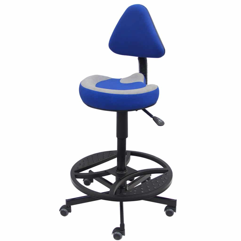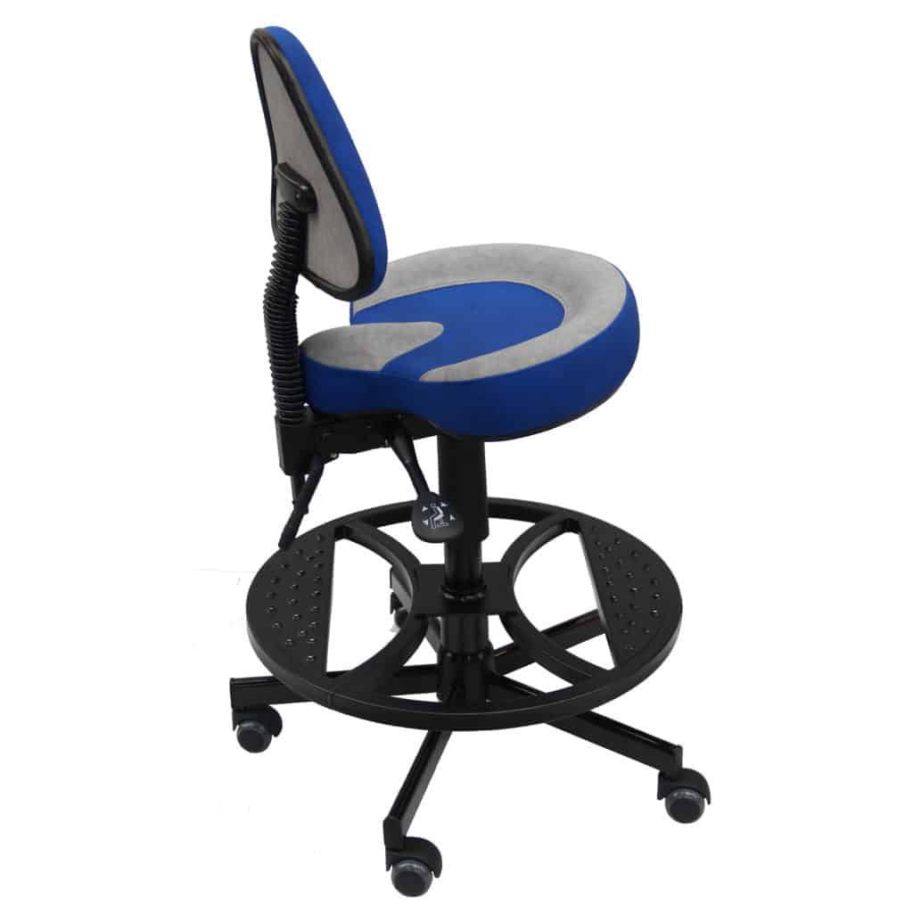 Assise et soutien ventral équipés d’un mécanisme asynchrone permettant le réglage indépendant de l’angle de l’assise (+5°/-6°) et de l’angle du soutien ventral triangle (+10°/-18°) EN-1335 avec blocage en toute position suivant l’utilisateur, permettant une posture assis debout confortable et ergonomique. Soutien ventral anatomique oscillant réglable en hauteur et inclinaison.