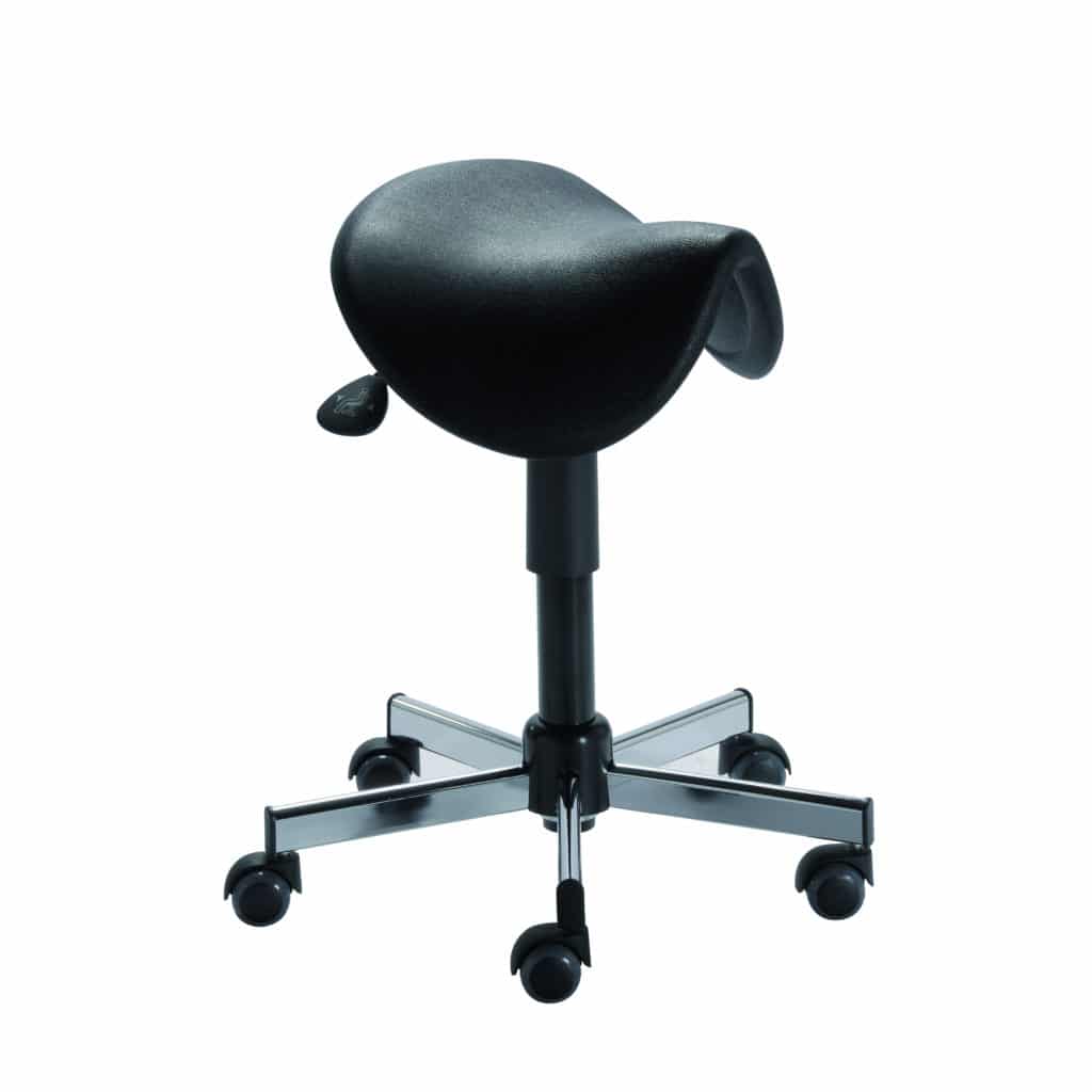 Assise équipée d’un mécanisme inclinable + 3°/-11° EN-1335 permettant une posture ergonomique, le positionnement des jambes forme un angle permettant au bassin de prendre une position optimale, la partie du corps est décontractée et droite améliorant ainsi la circulation du sang, réglage de la hauteur d’assise par vérin époxy noir pneumatique à gaz avec amortisseur d’assise, norme classe IV-DIN 4551.