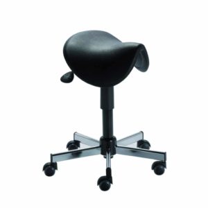 Assise en forme de selle de cheval L 360 x P 450 mm structure acier mécano soudée/ bois multiplis, assise suspendue par ressorts linéaires et dossier L 500 x H 390 mm. Garnissage mousse haute densité sans CFC. Procédé longévité KHOL de double encollage de la mousse de garnissage et du revêtement expansé vinyle non feu M2.